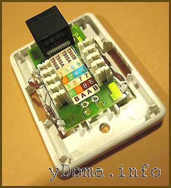 Но не всегда есть возможность свести разъемы utp кабеля в одну точку. В таком случае без дополнительного приспособления обойтись трудно. Конечно, можно удлинить конец щупа тестера на всю длину кабеля и вдвоем выполнить проверку, или обрезать одну из вилок RJ-45, зачистить провода и скрутить их между собой попарно. Но целесообразнее сделать простейшее приспособление из розетки для RJ-45, закоротив в ней пары отрезками проводников диаметром 0,5 мм или резисторами, как показано на фотографии. Резисторами лучше, так как это позволить проверить не только целостность проводников витой пары, а и наличие короткого замыкания между ними. Если измеренная величина сопротивления равна нулю, а не установленному в розетке, значит, проводники закорочены между собой. Номиналы резисторов для перемычек витых пар лучше взять разные, например 50, 100, 150 и 200 Ом. Тогда результаты измерений будут более информативными.