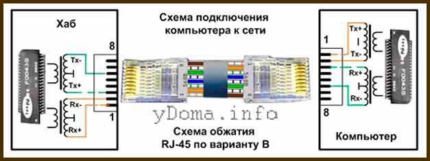 Для проверки кабеля витых пар со знанием дела желательно представлять, электрическую схему подключения кабелем витых пар сетевой карты компьютера с другими устройствами, хабом, свичем или другим компьютером. На рисунке представлена схема участка сети подключения компьютера к активному оборудованию, хабу или свичу.