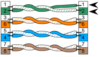 Перевернутая пара является ошибкой монтажа модульного разъёма или розетки (например RJ45). Также может называться обратной или реверсированной. Возникает, когда провода одной пары прикреплены к правильным контактам на одном конце кабеля, но на другом конце обращены. Жила, которая в начале линии имела порядковый №3 (рис. Пример перевернутой пары_1), в конце кабеля обжата на контакт №6, а №6 в свою очередь приходит на контакт №3. Данное повреждение может быть обнаружено любым тестером но локализовать его можно только визуально осмотрев коннектор.