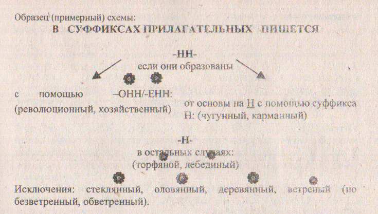 3. Повторить правописание суффиксов прилагательных с одной или двумя буквами Н можно, предложив учащимся составить удобную для пользования схему-таблицу по материалу § 38. (Наиболее удачные схемы можно оценить).