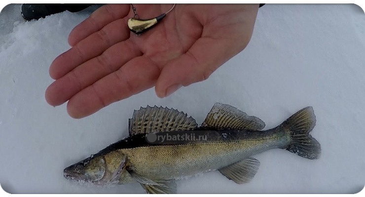 В ловле клыкастого хищника со льда зарекомендовали себя узкие блёсны красного, жёлтого и серебристого цвета. По длине приманки могут быть разными. Чаще всего используют блёсны в пределах 4–12 см. Вес подбирается с учётом условий ловли: в стоячей воде можно ставить относительно лёгкие модели (до 10 г), на течении лучше показывают себя тяжёлые (20–50 г).